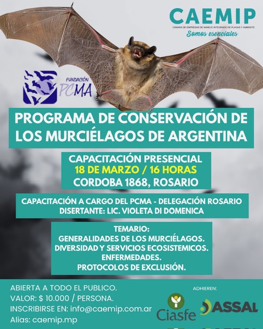 12 Mar 2026 Capacitación sobre conservación de murciélagos urbanos ORGANIZA: CAEMIP (Cámara de Empresas de Manejo Integrado de Plagas). Fecha: miércoles 18 de marzo 16 hs Lugar: Córdoba 1868, Rosario Modalidad presencial Compartir articulo Facebook Linkedin Twitter