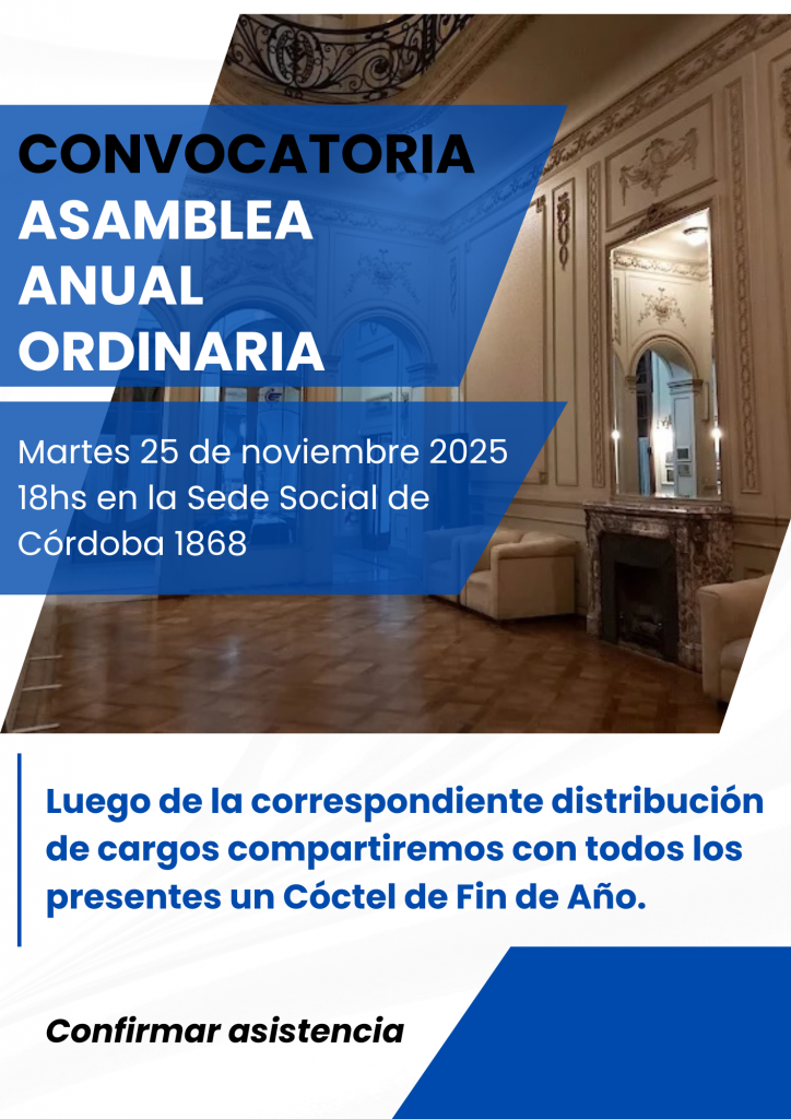 Tenemos el agrado de dirigirnos a Usted con el objeto de invitarlo a participar de la Asamblea Anual Ordinaria que se llevará a cabo el día, Martes 25 de Noviembre a las 18:00 horas en nuestra Sede Social de Córdoba 1868 con los alcances establecidos en los Estatutos Sociales y las disposiciones del Consejo Superior.