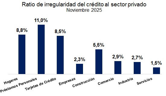 En noviembre, el ratio de irregularidad del crédito al sector privado se incrementó 0,7 p.p., alcanzando 5,2% a nivel sistémico. Al tiempo que, en noviembre de 2024 el ratio de irregularidad del crédito al sector privado había sido 1,5%.