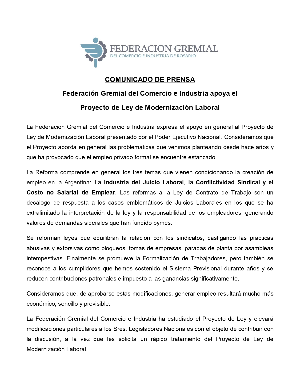 La Federación Gremial del Comercio e Industria expresa el apoyo en general al Proyecto de Ley de Modernización Laboral presentado por el Poder Ejecutivo Nacional.