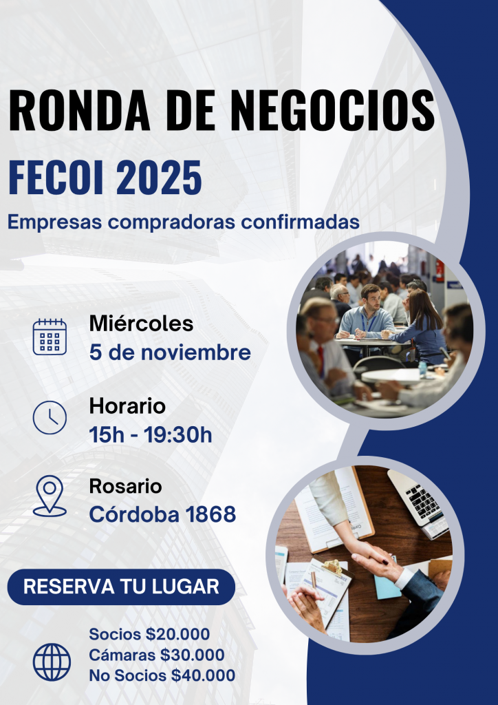 29 Oct 2025 Invitación! Ronda de Negocios Multisectorial FECOI 2025 «Organiza Federación Gremial del Comercio e Industria» Miércoles 5 de noviembre Córdoba 1868 – Rosario ️ 2 bloques 1º bloque 15h a 17h Coffee break 2º bloque 17:30h a 19:30h Empresas compradoras confirmadas: ACINDAR Metalúrgica básica FUNDAR Construcción MILICIC Construcción Obra Pública y Minería STARA Maquinaria Agrícola. TPR Terminal Puerto Rosario Compartir articulo Facebook Linkedin Twitter