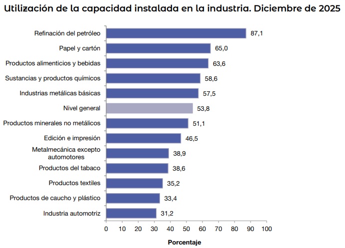 En diciembre de 2025, la utilización de la capacidad instalada en la industria se ubica en 53,8%, nivel inferior al del mismo mes de 2024, que fue de 56,7%.