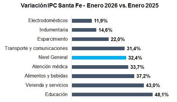 En términos interanuales, la inflación acumulada en la provincia alcanzó el 32,4%, igualando el nivel general nacional del 32,4% informado por el Instituto Nacional de Estadística y Censos (INDEC) para todo el país.